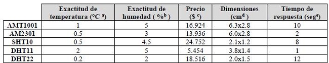 ■ Temperatura y humedad del aire: la Tabla 4 contiene variedad de sensores disponibles para la medición de la humedad y temperatura del aire con sus respectivas características.