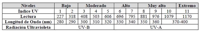 Radiación ultravioleta: la medición de la radiación ultravioleta a través del sensor GROVE UV requiere de un sistema estándar sencillo representado en la Tabla 8 en el cual se establecen los diferentes niveles e índices UV para cada lectura del sensor según [14].