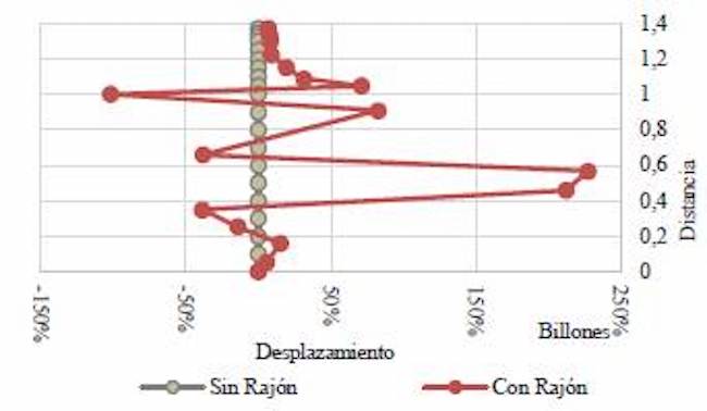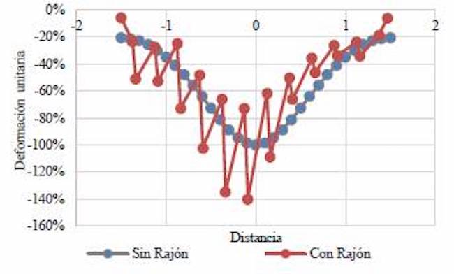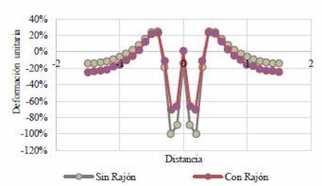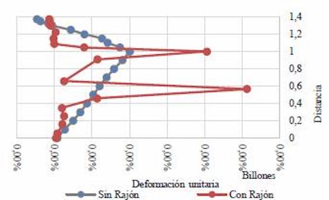 Se observó, de manera general, en el eje vertical (en el centro de la estructura), que los parámetros en estudio (deformación, esfuerzo y desplazamiento) fueron afectados sustancialmente en el área de influencia directa del rajón.