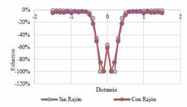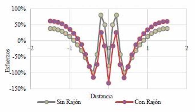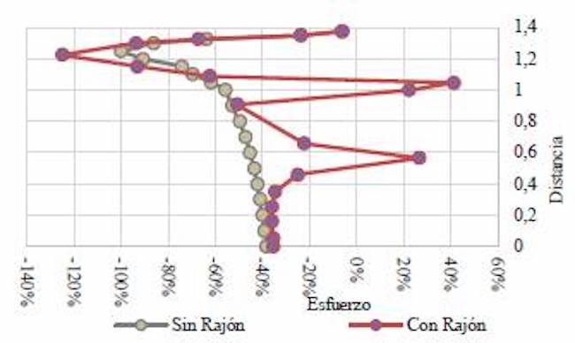 Teniendo en cuenta resultados críticos (máximos), los esfuerzos S22 de la parte superior de la subrasante (nivel 1 m), en muchos casos, presentan comportamientos a tracción, situación que se presenta entre más aumente el diámetro de rajón, como también entre más disminuya la separación entre estos.
