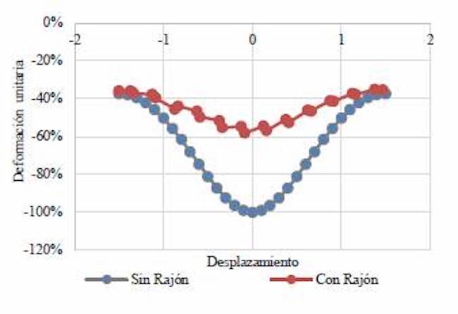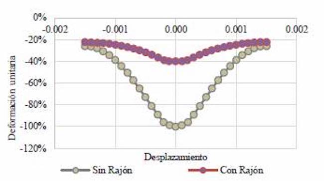 Al aumentar el diámetro del rajón, disminuyen los desplazamientos U22 y las deformaciones unitarias E22 en la subrasante, observándose que para la subrasante con CBR 1 % disminuyen hasta un 31 % y 9 1%, respectivamente, cuando el diámetro de rajón es igual a 0,35 m.