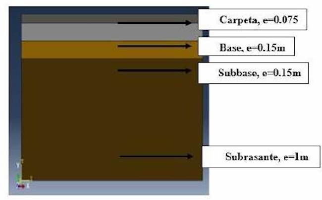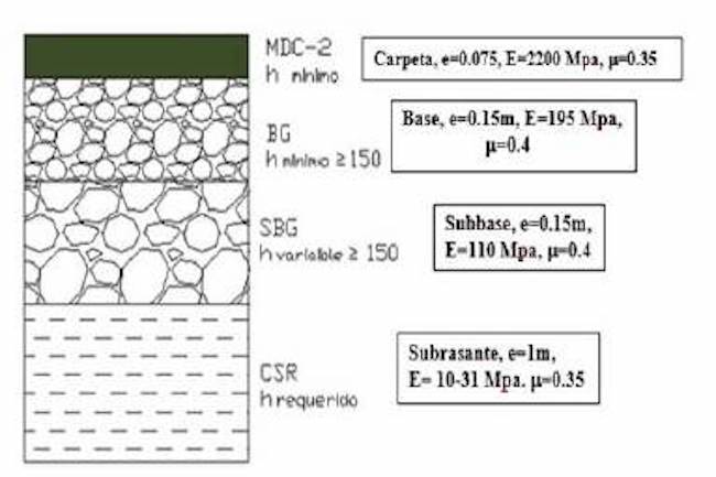 Las propiedades de los materiales propuestos para las distintas capas de la estructura de pavimento se supeditan en sus módulos de elasticidad y módulo de Poisson, los cuales son valores típicos en el medio [17, 18]. Incluyendo el módulo del rajón, de la siguiente manera: