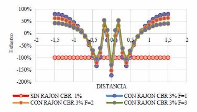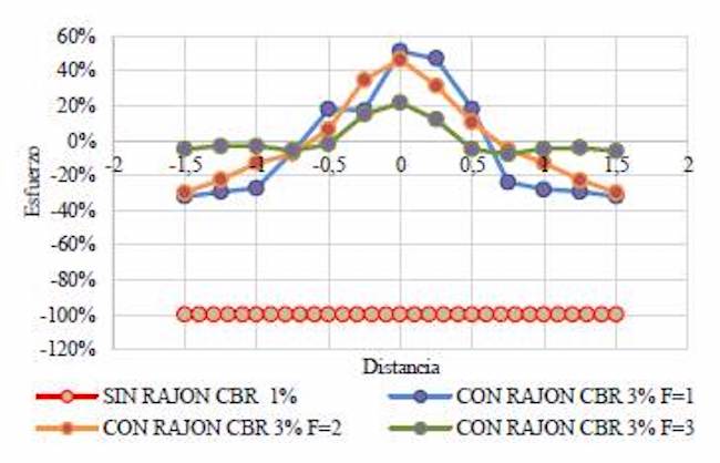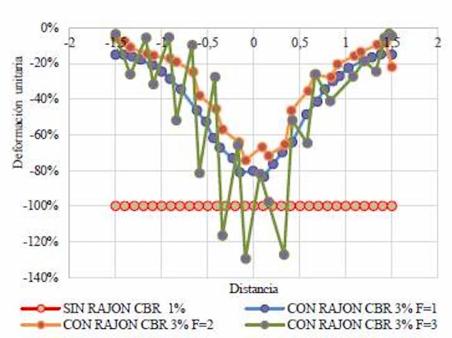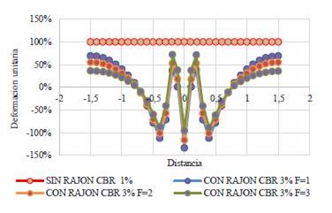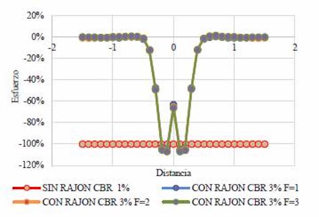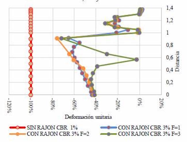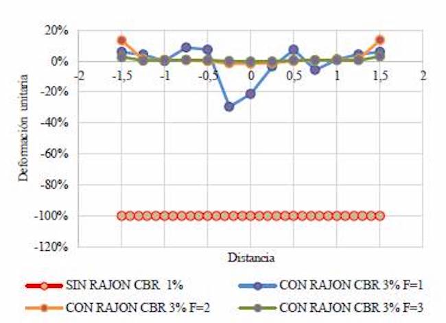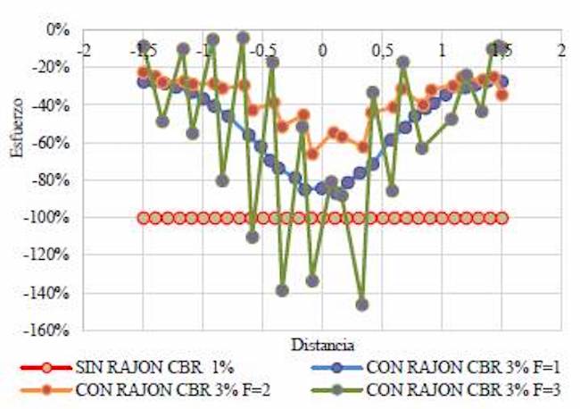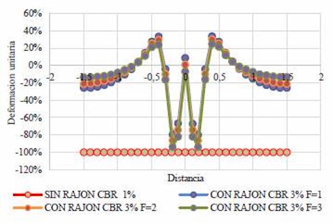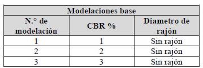 Una vez ejecutadas las modelaciones base para las estructuras de pavimento con diferente tipo de subrasante (1 %, 2 % y 3 % de CBR), se procedió a ejecutar las diferentes modelaciones con las estructuras de pavimento, mejorando la subrasante con rajón (veáse tabla 3).