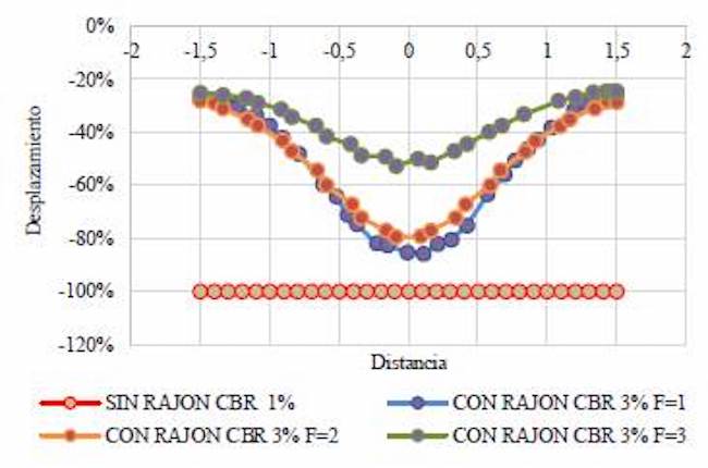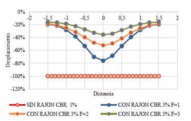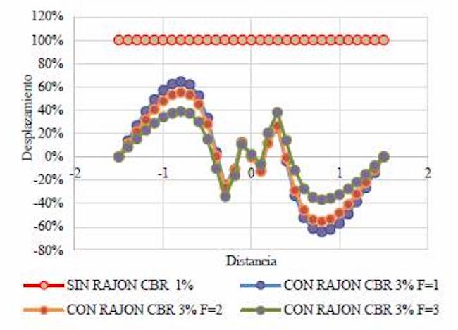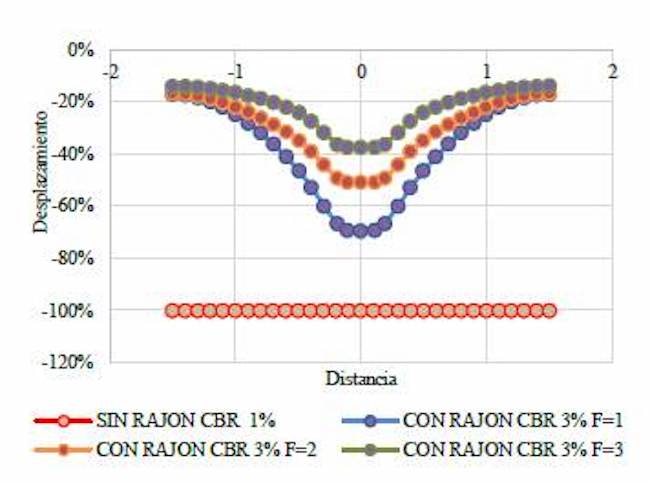 Se tienen las modelaciones comparativas y los resultados de análisis de las modelaciones de la 4 a la 42 con respecto a las modelaciones base. A continuación, se indica la comparación de las modelaciones de mismo CBR 3 %, diferente número de filas de rajón. Es importante notar que todas las diferencias porcentuales se amarran con respecto a la comparativa base de CBR 1 % sin rajón, para tener punto de compración entre todos los resultados.