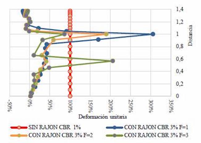 Al aumentar el número de filas de rajón en la capa de subrasante, disminuyen los desplazamientos U22 y las deformaciones unitarias E22 en la subrasante, observándose que para la subrasante con CBR 1 % disminuyen hasta un 59 % y 94 %, respectivamente, cuando se configuran 3 filas de rajón. Es de resaltar que para los casos de subrasantes con CBR 2 % y CBR 3 %, las deformaciones unitarias E22 en la subrasante disminuyen hasta un 100 % para la configuración correspondiente a tres filas de rajón.