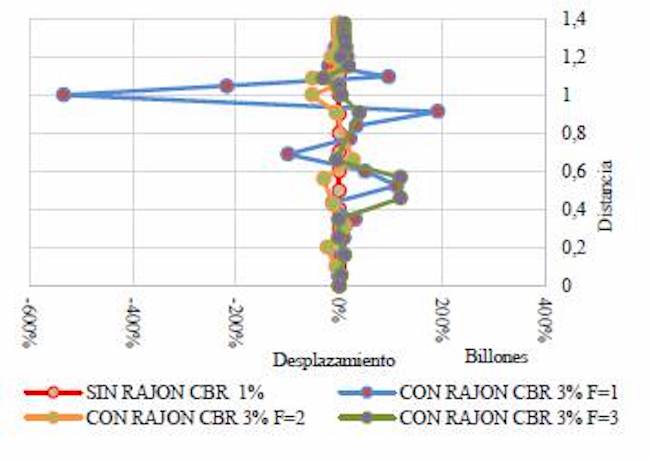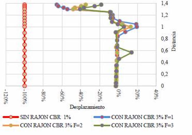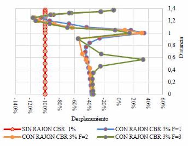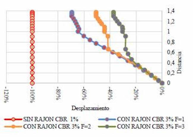 Para cada CBR se presenta mejor comportamiento de deformaciones, esfuerzos y desplazamientos en el nivel 0,7 m (véase figura 4) de subrasante a medida que disminuye la penetración del rajón.