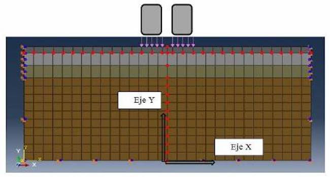 Se realiza un análisis de desplazamientos, esfuerzos y deformaciones unitarias a lo largo del eje "X" (horizontal), correspondiente a la parte inferior de la carpeta asfáltica, en la subrasante a nivel de 1 m y 0,7 m; también se annaliza el eje "Y' (vertical) que atraviesa el centro de la estructura de pavimento propuesta (nodos rojos) (véase figura 4).