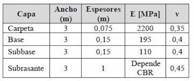 Los anteriores valores son módulos típicos obtenidos de diferentes formulaciones o métodos. Los módulos de Poisson son valores típicos para los diferentes materiales de la estructura de pavimento (véase la figura 2).