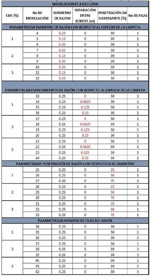 Inicialmente, se modelaron las estructuras de pavimento con los CBR de 1 %, 2 % y 3 %, las cuales son las modelaciones de referencia o base para determinar cómo el rajón cambia el comportamiento de la estructura. Luego, se realizaron modelaciones numéricas con el rajón y se probaron diferentes configuraciones de colocación del rajón, entre ellas: diámetro de la partícula, separación de las partículas (separación entre bordes externos de rajón), penetración de las partículas en la capa de subrasante (porcentaje de penetración de rajón en subrasante respecto a su diámetro) y número de filas colocadas.
