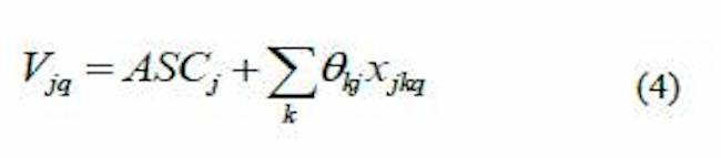Donde los parámetros θ se asumen constantes para todos los individuos y pueden variar entre alternativas. La ASCj es la denominada constante específica de la alternativa, que representa la influencia neta de todas las características no observadas del individuo o de la alternativa en el modelo especificado, como son: comodidad y conveniencia de uso de un modo de transporte específico. El individuo q elige la alternativa que maximiza su utilidad, es decir: