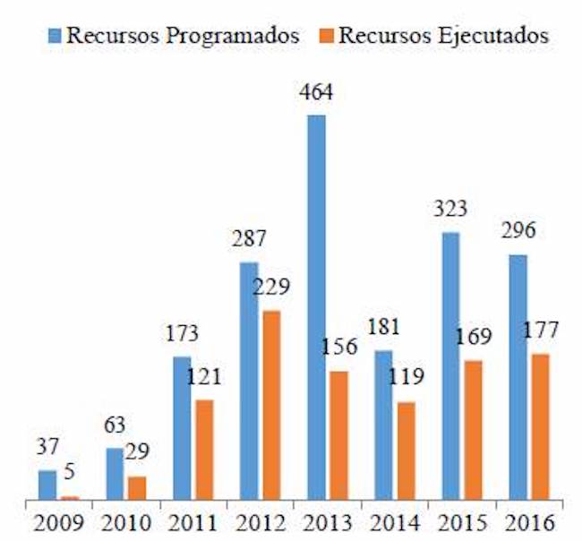 La dificultad inicial de los entes territoriales para la consecución de recursos necesarios para los traslados de redes de servicio público afectó el avance de los proyectos, ya que se encontraban en los componentes no elegibles de la cofinanciación. Lo anterior se debe a que los SETP se estructuraron presupuestalmente mediante convenios de cofinanciación, basados en diseños conceptuales; luego, al avanzar los diferentes estudios a nivel de factibilidad, las necesidades presupuestales se modificaron notablemente en los diferentes proyectos y componentes de cada sistema. Se resalta que siete de los ocho proyectos tenían previsto iniciar operaciones para el 2011 y se habían comprometido recursos por 2,3 billones de pesos de 2016. Las ejecuciones de estos recursos no se ajustaron a las cifras programadas inicialmente, tal como se ilustra en la figura 1. Cumplido el plazo (en diciembre de 2014) para la ejecución del 67 %, las ciudades solo habían ejecutado, en promedio, el 52 % de los recursos estipulados al inicio de los convenios de cofinanciación [7].