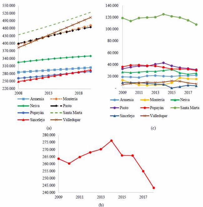 Al contrastar el crecimiento de la población [8] versus la variación del total de pasajeros transportados en el TPCU a partir de la Encuesta de Transporte Urbano de Pasajeros (ETUP) que posee el DANE [9], para estas ciudades en el periodo comprendido entre 2009 a 2018, se observa un crecimiento permanente de la población y una disminución de los usuarios del TPCU a nivel de cada ciudad y en el total de pasajeros transportados. Con base en la información del DANE se presenta la figura 2 que ilustra cada comportamiento. La parte (c) de la figura 2 detalla que en todas las ciudades analizadas existe una tendencia a la pérdida de pasajeros del TPCU cada año, donde Sincelejo es la ciudad que más disuade usuarios del transporte público. Este escenario es preocupante, si se tiene en cuenta que la población en cada una de estas ciudades ha aumentado. No obstante, esta situación puede presentarse por el alza de tarifas o por fallos en la calidad del servicio público. Otro factor que puede explicar la pérdida de pasajeros del TPCU es el aumento en el uso de la motocicleta como modo de transporte, tanto como vehículo de transporte propio o bajo el servicio de transporte informal o mototaxi. Este uso acelerado de la motocicleta ha traído otra problemática asociada, como lo es el aumento en las tasas de accidentalidad de estas ciudades. En la siguiente sección se presentan en detalle los antecedentes de dicha problemática.