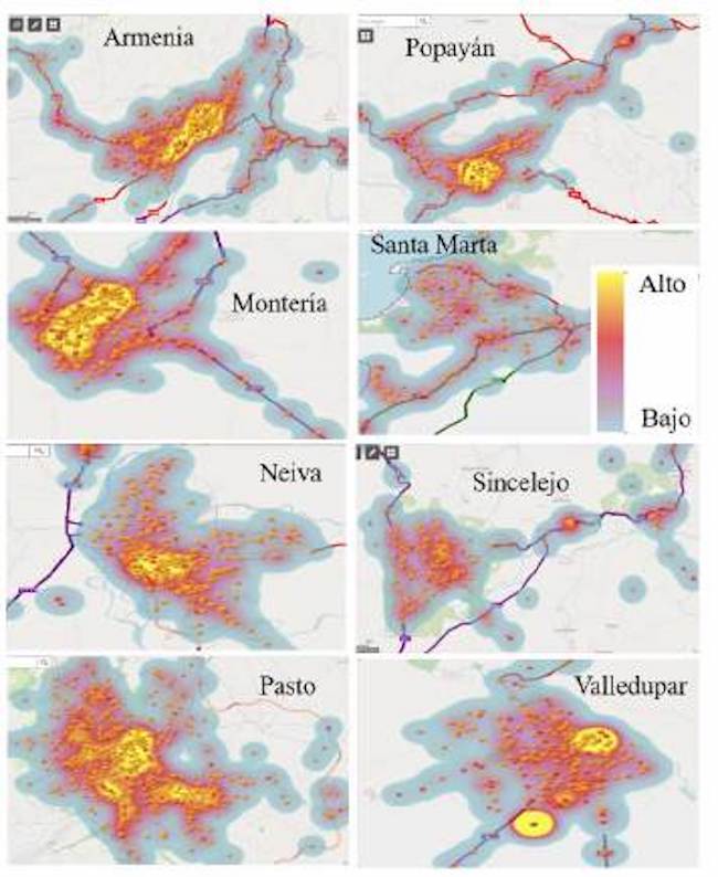 Al revisar la localización de los accidentes a través de mapas de calor (entre más amarillo, mayor cantidad de accidentes) del Geovisor de la Agencia Nacional de Seguridad Vial [12], se detalla la concentración de víctimas fallecidas y heridas en el casco urbano de los municipios que están implementando el proyecto SETP, tal como se muestra en la figura 3 que agrupa las imágenes de esta problemática social.