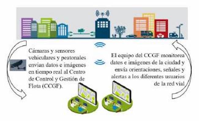 Permite monitorear, planificar, sincronizar y regular los flujos vehiculares y peatonales en las intersecciones de la red vial, bajo la gestión del CGCF. Se busca priorizar las rutas de transporte público mejorando la regulación semafórica, de tal manera que disminuya los tiempos de viaje y brinde una mayor seguridad al sistema. La figura 4 ilustra el esquema para gestionar la movilidad vehicular y peatonal.