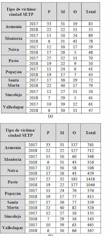 La tabla 2 muestra las cifras de fallecidos y heridos, de acuerdo con la condición agrupada de la víctima (P: peatón, M: motociclista, O: otros usuarios) durante los años 2017 y 2018, para las ciudades que están implantado el SETP. Se resalta que la gran mayoría de los fallecidos y heridos ocurren por el uso de la motocicleta, y los hombres son los que más fallecen (en promedio 81 %) o resultan heridos (en promedio 63 %).