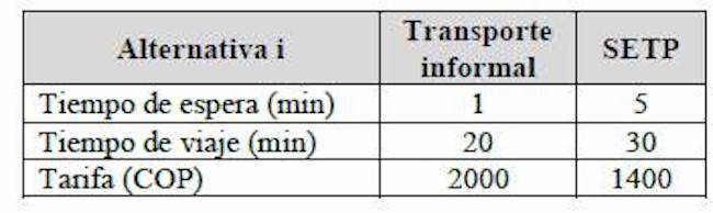 En este caso, la variable más restringida correspondió al (11) tiempo de viaje, encontrando que el tamaño muestral debería ser de 1948 observaciones, es decir, unos 216 individuos como mínimo, ya que cada encuestado contribuye en la muestra total con una cantidad de 9 observaciones, igual al número de opciones hipotéticas contestadas; teóricamente, este sería el tamaño muestral mínimo a considerar. En ella se estimó para el SETP subsidiado un descuento en la tarifa entre el 30 % y el 50 %, un tiempo de espera variable entre 5 y 15 minutos, un tiempo de viaje variable entre 20 y 40 minutos. Estas variables se correlacionan con el servicio del transporte informal actual. Una vez analizada la población objeto, se obtienen los parámetros de interés a partir de la estimación de modelos econométricos de elección discreta [16], los cuales permitirán una mejor representación de los patrones de comportamiento de los individuos en la elección, dentro del conjunto disponible de alternativas mutuamente excluyentes y colectivamente exhaustivas.