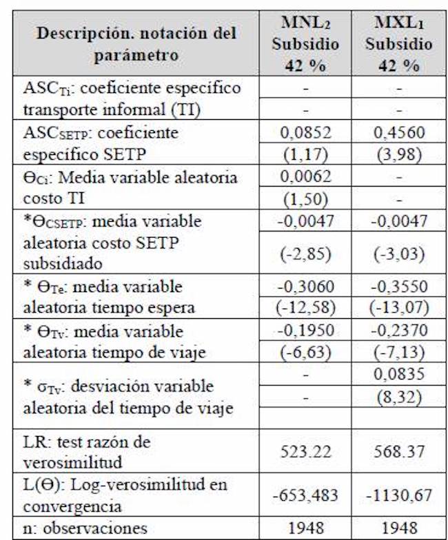 Se estima un modelo binario que incluya la elección entre las dos alternativas de utilizar el transporte informal y el SETP subsidiado. Luego, la especificación de la función de utilidad se obtiene a partir de la ecuación 10, es decir: