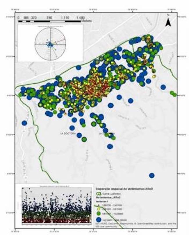 Como se puede observar en la figura 2, se registran para la zona de estudio los sitios o puntos de vertimiento en la cuenca La Doctora; dicha información está referida según las clasificaciones específicas: los puntos rojos y amarillos, los de menor aporte (inferiores a 19,23 m3/mes); verdes y azules, las mayores descargas (hasta 8.568 m3/mes). Es decir, los puntos verdes y azules, relacionados con las mayores descargas de ARnD, corresponden a un 50 % de los aportes y significan un total de 1.165 descargas (67.689,075m3/mes).