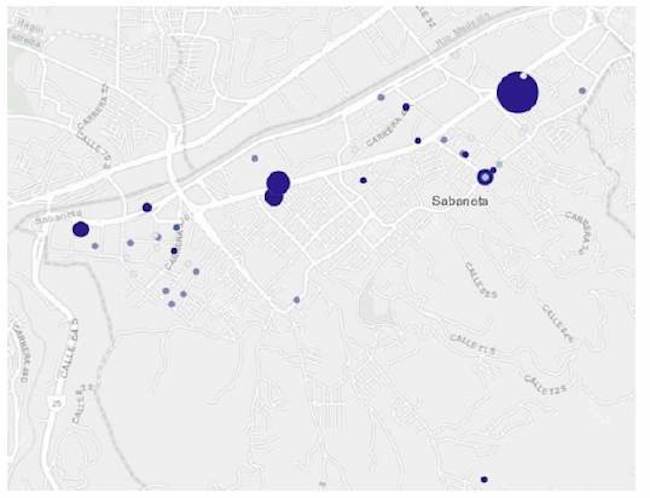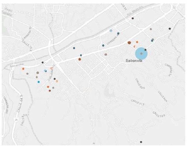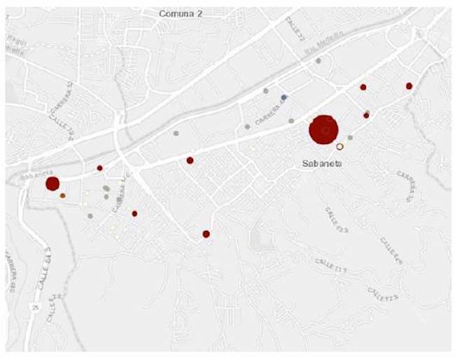 En la figura 4 se presenta un detalle de la información relacionada con el daño potencial a la red, obtenido a partir del uso de ArcGis y de la información por autodeclaraciones. En dicha figura se resumen los daños potenciales a la red destacados, con base en los puntos críticos, donde se relaciona la variable pH a partir de colores oscuros, mientras que las altas cargas contaminantes (parámetro grasas y aceites) son representadas a partir del tamaño del círculo. Por lo tanto, mientras más oscuro sea el punto, se presenta un valor más crítico de pH para la red de alcantarillado, y, de otro lado, su tamaño se asocia con la concentración de grasas y aceites presentes en el vertimiento.