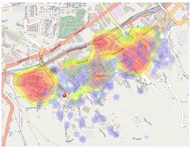 De la figura se puede observar que en la parte central se registra un fenómeno de alta concentración de vertimientos en el área, relacionado con el sector de la construcción, pues la zona tiende a ser llamativa para el uso residencial. De acuerdo con los resultados obtenidos se encuentra que el ARnD presenta un comportamiento espacial agregado, según el caudal promedio mensual entregado a las redes de alcantarillado público (66.886 m3/mes). Los resultados permitieron observar que la carga contaminante está definida según el caudal y el tamaño de la industria, y no con base en el tipo de actividad productiva [14].
