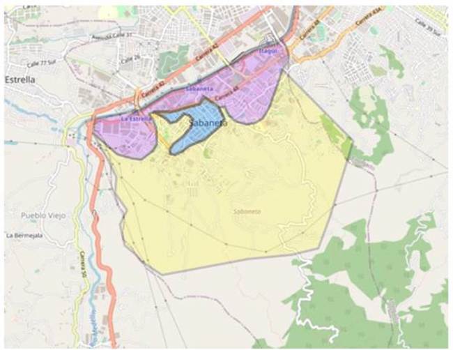 Corresponde a la zona central del municipio de Sabaneta y reporta un fenómeno de interés para el control de vertimientos. Lo anterior, debido a que existe una alta presión de ARnD por caudal, a pesar de no contar con registros de autodeclaraciones de industrias en la zona. Esta parte de la cuenca registra una alta presión de ARD y, por lo tanto, es un distrito sanitario (véase figura 8, color azul) que alcanza un área cercana a los 0,4 km2.