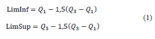 Los datos atípicos que fueron registrados por la estación meteorológica fueron extraídos utilizando la ecuación (1). Las variables Q1 y Q3 representan el primer y tercer cuartil de los datos de cada variable y los valores que sean menores que límite inferior - LimInf o mayores que el límite superior - LimSup se consideran datos atípicos [26].