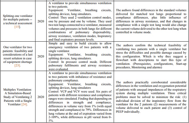 Some other authors, through letters to journal editors, expressed their concerns about the results of these experimental studies [35], [36], giving their opinions on the significant risks to patient safety (inability to individualize the ventilation of each patient, insufficient monitoring, cross-contamination, rebalancing of the airflow when a patient improves or deteriorates), which is shared by some medical associations that discourage the use of this methodology [37] and add that there would be logistical challenges to implement them and ethical problems.