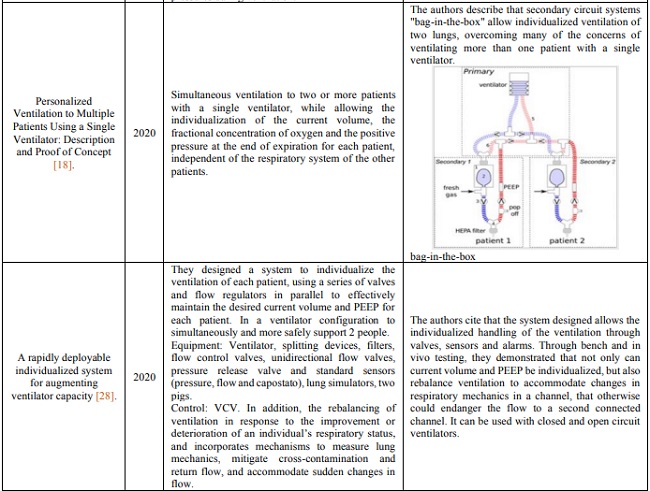 From previous studies, it can be noted that the initial idea, although innovative, carries dangers for patients. These risks were subsequently addressed by other researchers, who tried to solve them through the inclusion of accessories to the respiratory circuits that connect the ventilator to patients, to individualize the ventilation and monitoring system, for everyone connected to the ventilator.