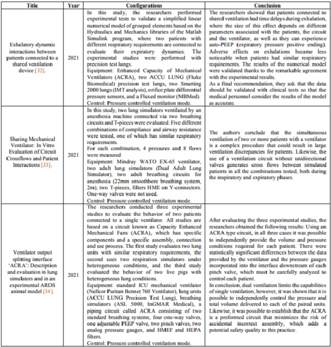 The idea of using a flow-splitting device has been approached experimentally by several research groups, where using simulators of lungs, animals, or in short intervals of time in humans, aim to determine the reliability of the method and the parameters to be configured in the ventilator for multiple pulmonary ventilation. In Table 1 are shown the studies carried out regarding the subject, including, configuration and main results:
