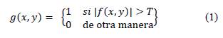 Los objetos presentan uniformidad en una o más características y se deben identificar los píxeles que presentan continuidad y una propiedad en común. La umbralización es una técnica de segmentación de regiones a partir del umbral, el cual se conoce como un valor de intensidad positivo T que determina la cantidad de píxeles considerados pertenecientes a uno de los dos subconjuntos: blancos (0) o negros (1). Por lo tanto, la umbralización de una imagen en escala de grises se basa en el siguiente método: si el valor de gris de un píxel f (x;y) es menor o igual que el umbral T, se le asigna el valor de 1; de lo contrario, se le asigna un valor de 0. De esta manera, es posible separar el objeto presente en una imagen aplicando 1 donde el resultado es una imagen b inarizada g(x;y) [7].