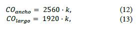 Calibrado el sistema, se adquieren las imágenes de muestra a una resolución espacial de 2560x1920 pixeles. Las medidas en unidades métricas del largo (COlargo) y ancho (COancho) del campo de observación están dadas por las ecuaciones (12) y (13) respectivamente: