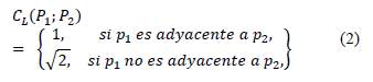 Se halla el perímetro (Ppx) en unidades de píxeles a partir del contorno de la región R (Cr), como se muestra en la figura 1(a), agrupando los píxeles según la contribución de longitud de cada píxel (Cl) al perímetro a partir de su adyacencia, como se denota en la ecuación (2):