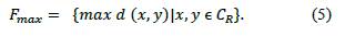 El diámetro máximo Fmax es la distancia euclidiana máxima calculada en píxeles, entre todos los pares de píxeles d(x,y), que pertenecen al contorno de R (CR) como se define en la ecuación (5),