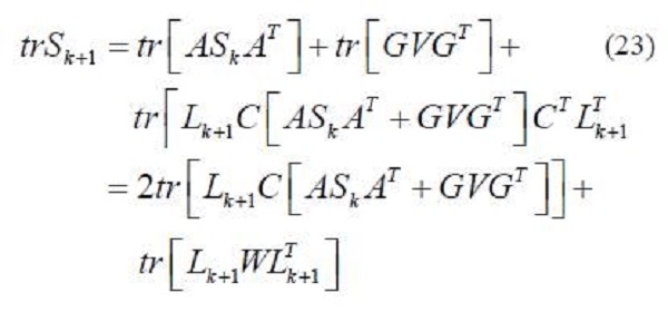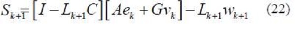 la covarianza a posteriori. Cuanto menor sea la matriz de covarianza Sk, menor será la variabilidad del error de estimación debida a ruidos, y mejor será el rechazo de estos. El estimador con todas las consideraciones puede simplificar la ecuación, xk + 1 es el estado siguiente, el cual solo depende del estado anterior (proceso de Markov) [7] [8].
