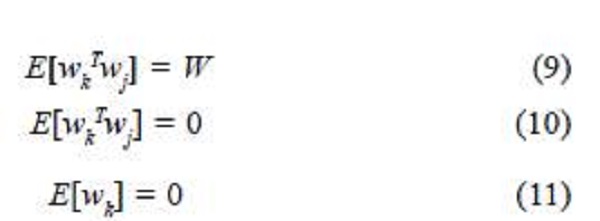 Las señales de entrada vk y wk que se relacionan en el anterior modelo hacen referencia a ruido blanco estacionario con media cero y no están correlacionadas entre sí, lo que significa que presentan las siguientes propiedades [4].