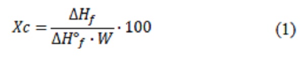 Las mediciones del análisis térmico se llevaron a cabo en un calorímetro diferencial de barrido automático, marca Shimadzu, modelo DSC-60A. Los ensayos fueron realizados en una atmósfera de nitrógeno con un caudal de purga de 40 mL/min. Para determinar la temperatura de fusión (Tm) de los materiales, la muestra de 2,5-3,5 mg se calentó desde 50 hasta 220 °C a la velocidad de 10 °C/min. El porcentaje de cristalinidad (Xc) se calculó empleando la ecuación 1, la cual se muestra a continuación: