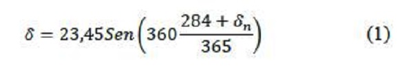 Para calcular G, es necesario inicialmente determinar la declinación solar (δ), que es el ángulo formado entre el plano ecuatorial celeste (proyección del ecuador terrestre) y la línea sol-tierra; δ se puede determinar empelando la ecuación 1 [17], [18].