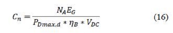 Una vez determinado el número de módulos fotovoltaicos, se procede a dimensionar el banco de baterías. Para este propósito es importante tener en cuenta la máxima profundidad de descarga diaria (𝑃𝐷𝑚𝑎𝑥,𝑑), la eficiencia de la batería (𝜂𝐵) y el número de días de autonomía. Para 𝑃𝐷𝑚𝑎𝑥,𝑑 y 𝜂𝐵 se establece un valor del 80 % y 85 %, respectivamente, y además se fija un número de días de autonomía (𝑁𝐴) de 1. Se calcula la capacidad nominal (𝐶𝑛) necesaria del banco de batería empleando la ecuación 16 [22], [24].