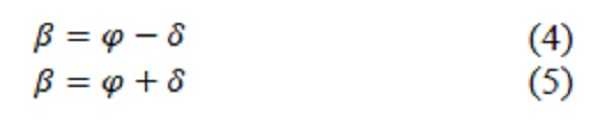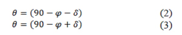 Por otra parte, el ángulo de elevación solar (θ) puede ser determinado empleando la ecuación 2 y 3 en el solsticio de invierno y verano, respectivamente [17].