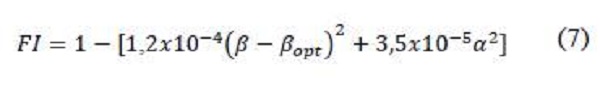 Como es ampliamente conocido, de ser posible, se debe orientar de forma óptima (α = 0°, βopt) la superficie del panel, no obstante, este criterio no siempre es factible. La orientación de los paneles se puede ver afectada por la integración arquitectónica, la resistencia al viento, etc. En este sentido, en los módulos fotovoltaicos se pueden dar pérdidas de irradiación solar, debidas a una orientación e inclinación del módulo fotovoltaico diferente de las condiciones óptimas para el factor de irradiación (FI), y pérdidas debidas a las sombras proyectadas por objetos circundantes sobre el módulo fotovoltaico. FI se puede determinar empleado las ecuaciones 7 y 8 [19].