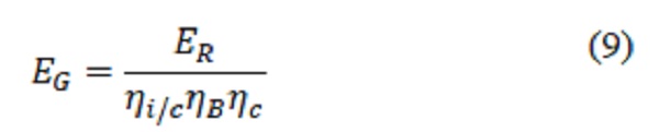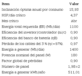 La carga total DC y AC por día son 400 Wh/día y 700 Wh/día, respectivamente. La energía total requerida (𝐸𝑅) es igual a 1100 Wh/día. Considerando una eficiencia del inversor/controlador (𝜂𝑖/𝑐) y del banco de batería (𝜂𝐵) del 90 % y la pérdida de los cables del 3 % (𝜂𝑐=97%) [24], la energía para generar por día (𝐸𝐺) se puede determinar mediante la ecuación 9 [22], [24], [25].