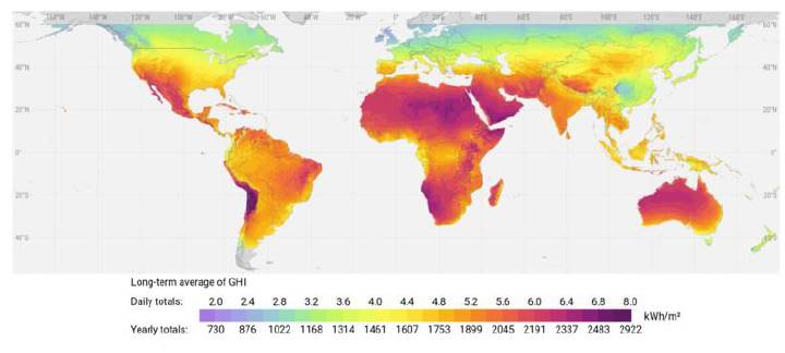 El potencial disponible del recurso solar en cualquier localización se puede determinar mediante el parámetro de la irradiación horizontal global (GHI), el cual se compone de la suma de la irradiación tanto difusa como directa que puede llegar a recibir una superficie horizontal. Las unidades de GHI se miden en kWh/m2/día. El valor de GHI permite comparar el potencial de una localización para la generación de energía eléctrica sin antes considerar una configuración técnica y un modo de funcionamiento. No obstante, en una localización determinada, el GHI depende de la temperatura del aire, la velocidad del viento, el polvo y otras sustancias contaminantes de la atmósfera. Los valores de GHI a nivel mundial se muestran en la figura 1, donde es posible identificar los países con mayor potencial para recibir la radicación solar [5]. La irradiación promedio en Colombia es alrededor de 4,5kWh/m2/día, este valor de irradiación supera el promedio mundial que se encuentra en 3,9 kWh/m2/día, y es superior al promedio de 3,0 kWh/m2/día recibido en Alemania, país referente a nivel mundial en el uso de la energía solar fotovoltaica, con una capacidad instalada en su matriz energética de alrededor de 36 GW.