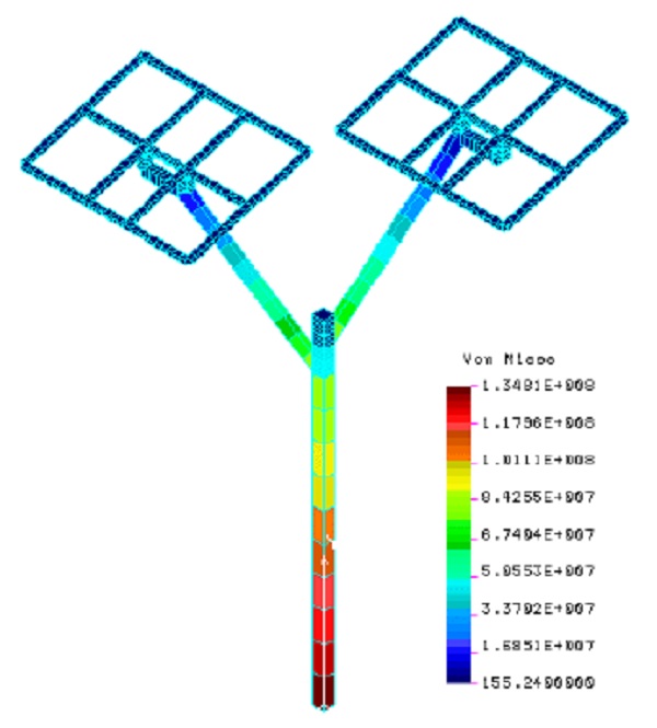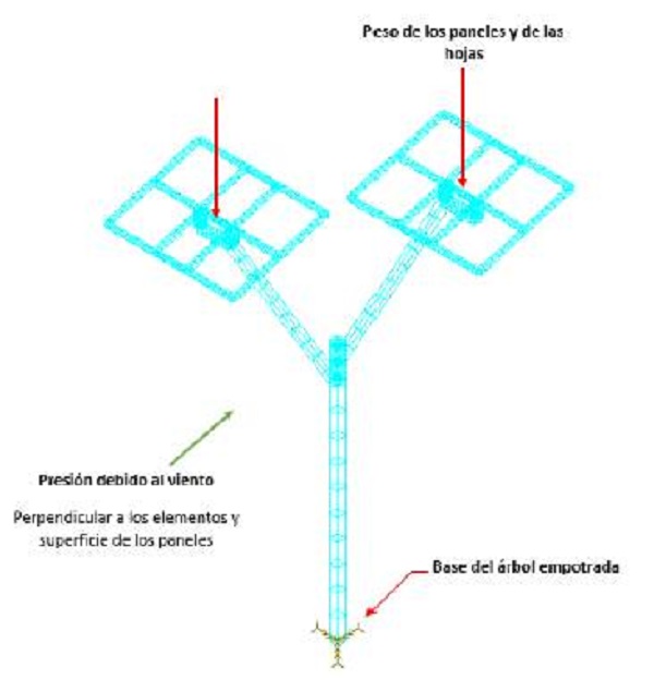 La integridad estructural del árbol fue verificada usando el software de elementos finitos Cosmo M. Con el software se pueden analizar geometrías complejas ante diversos estados de carga. Para este propósito se asignan las secciones transversales, dimensiones y materiales a los elementos modelados; se definen las cargas (peso de los paneles fotovoltaicos 16,4 kg, presión debido al viento y peso de las hojas de aproximadamente 8 kg cada una) y la gravedad para considerar el peso propio de la estructura; se malla la estructura, y finalmente se realizan los cálculos estructurales que permiten determinar los desplazamientos, deformaciones y los esfuerzos de los elementos de la estructura. Los esfuerzos de la estructura serán comparados con la resistencia de los materiales.