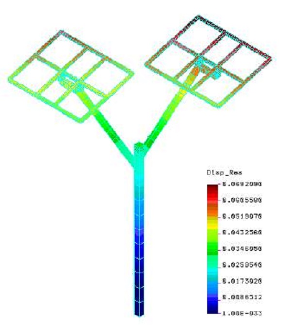 El desplazamiento máximo de la estructura es 0,069209 m, como se muestra en la figura 11. Este desplazamiento máximo se presenta en la estructura de soporte de los paneles.