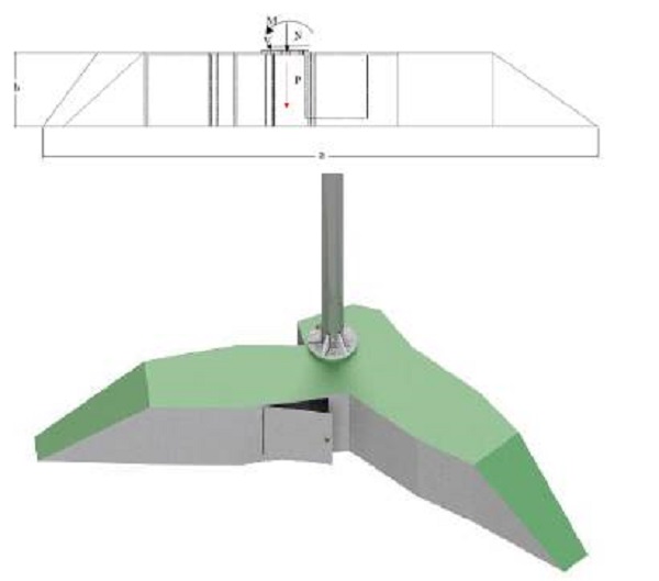 Donde N, V, M son las reacciones que aparecen en la base del árbol debido al peso de los paneles solares y al propio peso de la estructura, las cargas accidentales y el efecto del viento. N es la carga axial; V, la fuerza cortante; y M el momento flector. El peso de la base se define en función de su volumen y de la densidad de concreto, que se asumió igual a 2200 kg/m3.