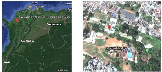 Para el diseño del árbol solar, se requiere una estimación del recurso solar en el lugar de instalación del árbol, el cual será ubicado en la seccional del Bajo Cauca de la Universidad de Antioquia. La seccional se encuentra localizada en las coordenadas latitud 7,990584° y longitud -75,193100°, como se muestra en la figura 2.