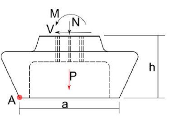Desde el punto de vista estructural, el tronco del árbol y la cimentación son los elementos críticos que definen la estabilidad del árbol. Dicha estabilidad se ve comprometida por las fuerzas exteriores, principalmente debido al peso propio de la estructura, a la fuerza del viento y al peso de los paneles fotovoltaicos. En consonancia con lo anterior, es importante diseñar una base o cimientos sólidos para sostener el árbol. Debido a que uno de los requerimientos estructurales es la portabilidad del árbol, se determinó diseñar una base de concreto portable a la cual se anclará el árbol. Esta base, además de servir de soporte, va a contener el banco de batería, inversor y controlador de carga. La altura del árbol, el número de paneles y en general las cargas sobre la estructura determinan el tamaño de la base. El esquema de diseño de la base del árbol se muestra en la figura 7. Para evitar el vuelco del árbol, se debe garantizar que los momentos estabilizadores (Me ) sean mayores que los momentos al vuelco (Mv ). Para este propósito se deben calcular las dimensiones principales (a, h) y el peso adecuado de la base (P). Se define el factor de seguridad (Fs_v) al vuelco mediante la ecuación 18.