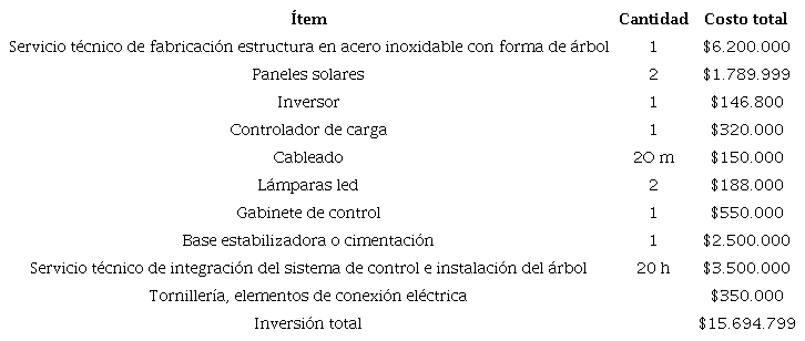 Un breve análisis de costos de fabricación del árbol se muestra en la tabla 11. Los costos de los elementos necesarios para el correcto funcionamiento del árbol han sido consultados con proveedores locales de la ciudad de Medellín. El precio en pesos colombianos sería igual a $15.694.799, que equivalen aproximadamente a 3.924 dólares.
