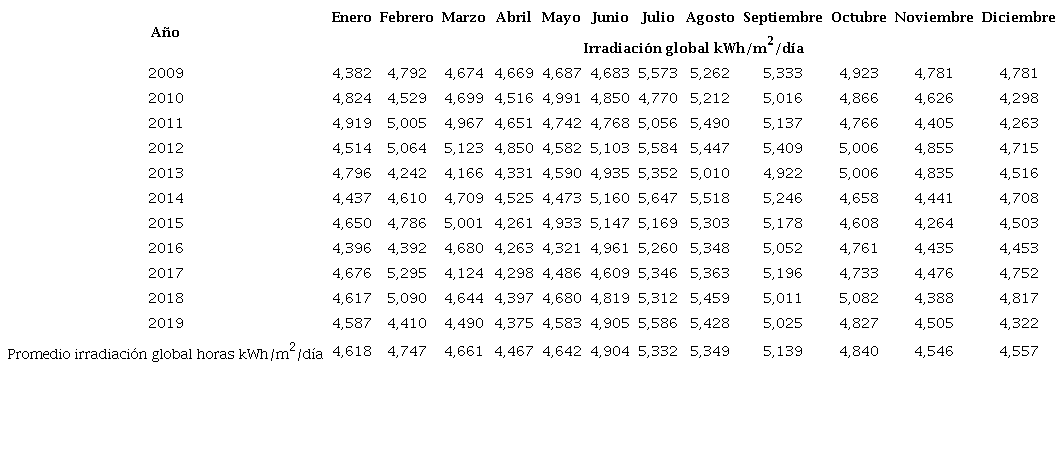 Se emplearon los registros promedios de irradiación solar de los años comprendidos entre 2009 y 2019 para el dimensionamiento del sistema fotovoltaico entre estos años. A partir de la irradiación, es posible determinar las horas solar pico (HSP) en el sitio de instalación del árbol solar. Las HSP representan las horas de sol equivalentes con una intensidad de radiación de 1000 W/m2 que incide sobre el panel fotovoltaico.