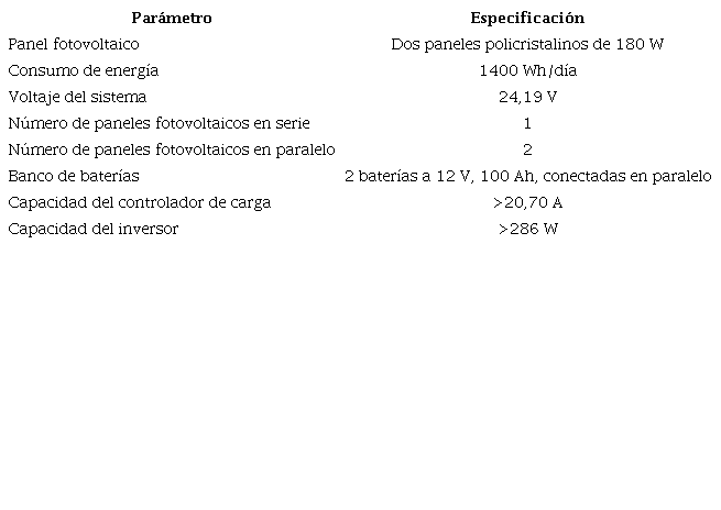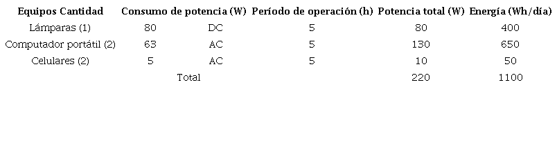 La capacidad instalada debe ser 220 W o una capacidad de generación de 1400 Wh/día, correspondiente al consumo esperado de 2 portátiles conectados 5 h al día, el consumo de 2 celulares conectados 5 h al día y el consumo de una lámpara de iluminación de 80 W conectada 5 h al día.